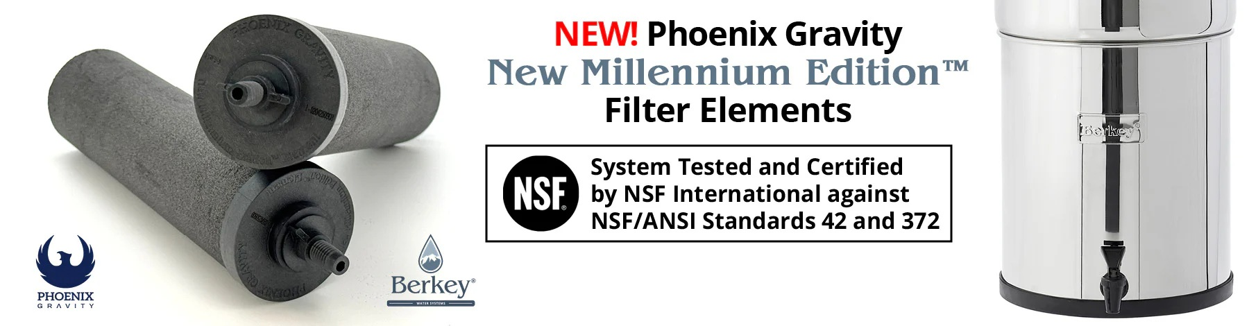 - Phoenix Gravity New Millennium Edition™ Filter Elements are manufactured for New Millennium Concepts, Ltd., as economical replacement filters in lieu of Black Berkey® Elements for use in Berkey® gravity-fed water filter systems and other brands of gravity-fed water filter systems.